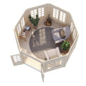 | Description | It`s an 8-corner house with with seven openable double windows (all complemented with wind barriers) and a double door as the entrance. The roof, as well walls are composed of 8 ready blocks. Roofing shingles are supplied as optional extras. |