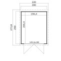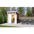 Area ca 4,2 m2 Dimensions 273x170 cm - Rear wall height ca. 190 cm - Front wall height ca. 230 cm - Made of northern spruce - 16 mm pre-assembled elements - 16 mm roof & floor boards - 1020x1820 mm door with lock - Delivery includes: eave edgings, fascia boards, roofing felt, assembly kit & installation manual