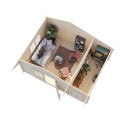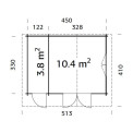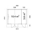 | Description | Wall thickness 34 mm Wall measures 450x330 cm Log measures 470x350 cm Canopy roof 70 cm Side wall height ca. 205 cm Ridge height ca. 268 cm Area ca. 14,2 m2 Volume ca. 33 m3 Roof area / gradient ca. 22,3 m2 / 21,2°; 14,7° |